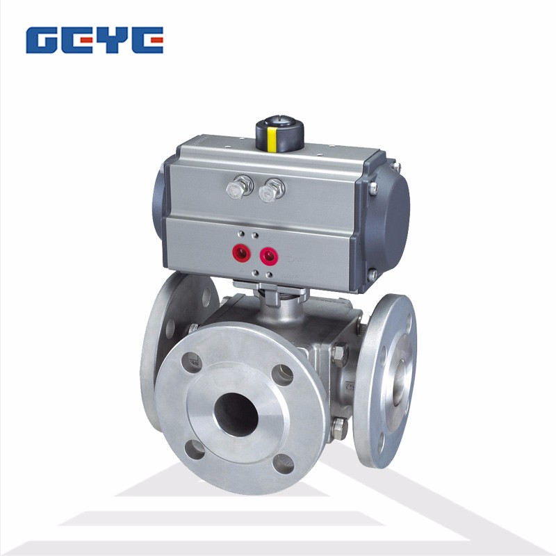 L型、T型氣動三通球閥Q644F,Q645F氣動三通球閥產品簡述: Q644F,Q645F氣動三通球閥可靠性高,設計實現了輕量化,使用壽命長,流通能力大,阻力小。氣動三通球閥有T型和L型。T型三通球閥能使三條正交的管道相互聯通和切斷第三條通道,起分流、合流作用。L型三通球閥只能連接相互正交的兩條管道,不能同時保持第三條管道的相互連通,只起分配作用。 &nbs
